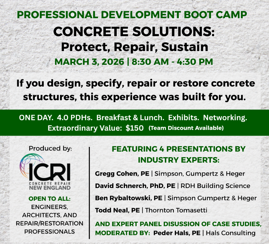 A one-day, 4.0 PDH professional development experience built for engineers, architects, and contractors responsible for the design, detailing, protection, and repair of concrete structures.